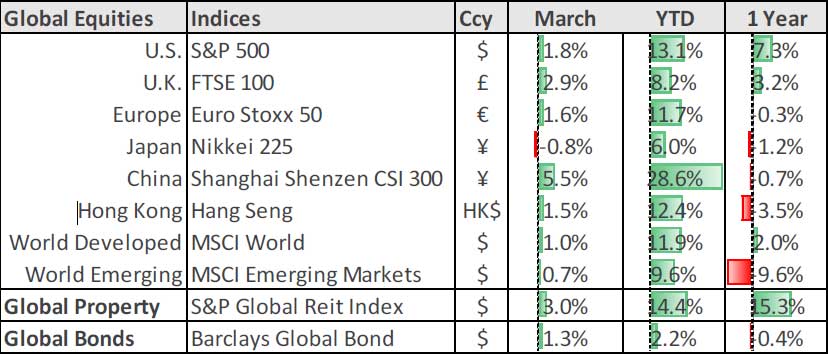 The positive start to the year continued in March with most major indices showing positive returns. Things certainly don’t seem as dire as they did in December.