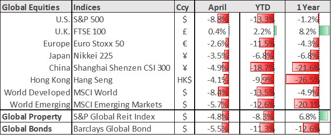 Markets fell sharply in April against a backdrop of deep uncertainty about the trajectory of energy prices, inflation, global growth, and the Fed’s monetary policy. In the US, the S&P 500 index fell by 8.8%for the month while Europe’s Euro Stoxx 50 index declined by 2.6%. In Asia, Japan’s Nikkei 225 index dropped 3.5% while Hong Kong’s Hang Seng index declined by 4.1%.