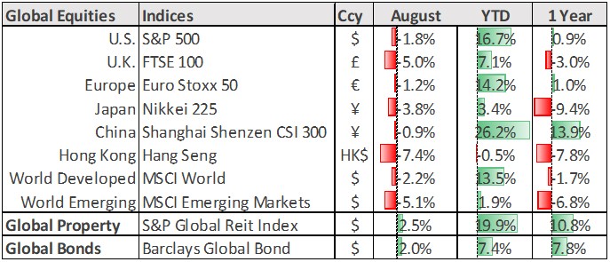 Global equity markets were mostly lower in August while bonds and listed property benefitted from lower interest rate expectations.