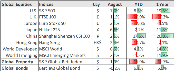 All major equity markets made positive gains in August, again led by a strong US stock market.