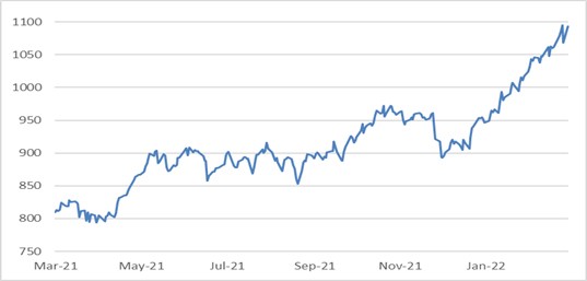 Benefitting from the turmoil was the commodity sector. Russia and Ukraine are major grain exporters, while Russia is rich in energy and metals. Oil prices surpassed $100 a barrel for the first time in over seven years on supply fears. Brent crude closed out the month at $101 a barrel, again of 10.7% m-o-m and follows a gain of 17.3% in January.