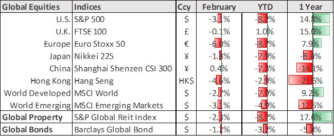 Global markets declined for the second month in a row as geopolitical risks dominated headlines following the Russian invasion of Ukraine. The S&P 500 index declined by 3.1% in what was a highly volatilemonth of trading. In Asia, Japan’s Nikkei 225 index fell 1.8% while Hong Kong’sHang Send index dropped 4.6%.