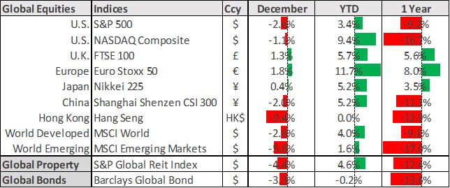 Higher interest rates are a headwind for risk assets as companies navigate the challenge of higher wage levels, rising input costs and a deceleration in consumer activity. The earnings performance of S&P 500 companies during the Q4 earnings season continued to show an overall weakening in earnings and earnings expectations. With approximately 95% of S&P 500 companies having reported results by month-end, 68% reported positive earnings surprises (source: FactSet Research). This is below the long-term average above 70%.