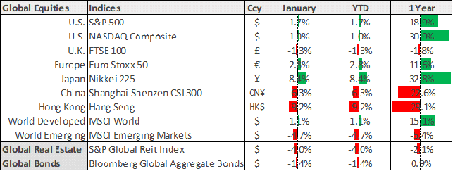 Global markets were mixed in January as conflicting economic data pointed to uncertainty over the timing of central banks’ monetary policy pivot this year. Geopolitical concerns also weighed on investor sentiment. Developed market equities posted modest gains (MSCI World +1.1%) while emerging markets declined (MSCI EM -4.7%), largely driven by continued weakness in Chinese equity markets.