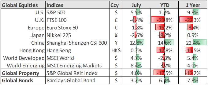 The S&P 500 Index gained 5.5% in July following robust financial results from tech heavyweights Apple (+18.4%), Amazon (+9.5%) and Facebook(+8.7%). In China, the blue-chip CSI300 Index rose 12.8% while in Europe stocks were more subdued with the Euro Stoxx 50 Index declining 1.8% for the month.