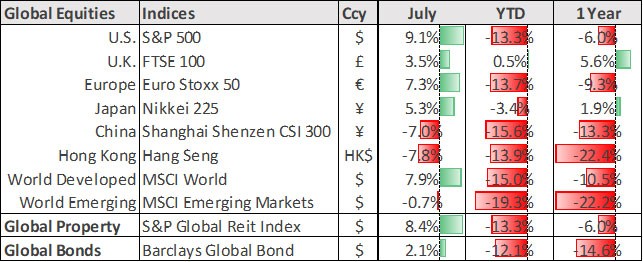 Economic data released in July provided further evidence of a slowing global economy, while inflation continued to rise to new highs and flash PMIs indicated that activity was losing momentum. US equity markets staged a strong July rally as negative economic data boosted the view that the US Federal Reserve will ease the pace of monetary tightening in the months to come.
