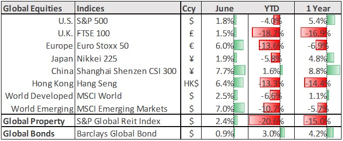 Markets closed out the second-quarter with positive gains. Most major indices are still deeply in the red year-to-date but are significantly better off than the March 23rd lows. US markets have led the way with a determined rally while Europe is still struggling to erase losses. The rally has been driven by unprecedented central bank action (QE), major interest rate cuts, optimism over COVID treatments/vaccines, and no shortage of FOMO - fear of missing out on a market rally.
