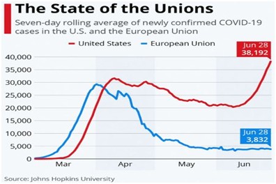 The dreaded second wave of infections is upon the US. America engaged in a more voluntary shutdown than Europe and Asia. The reopening of the US economy has coincided with nationwide protests (not good for social distancing),hence the rapid rise in infections in June. It is doubtful that the US will have enthusiasm for a new round of shutdowns due to fatigue, so one can expect some unpleasant headlines ahead.