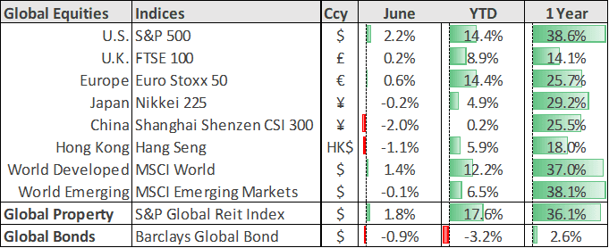 Global markets put in a mixed performance during June. Asian markets were weaker while European equities made modest gains. US markets gained as technology stocks came back into favour as inflation concerns eased.