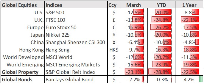 The S&P 500’s closing low of 2,304 on Monday 20th March was the fastest peak-to-trough drop in market history, at 23 trading days. One of the biggest casualties has been energy markets with Brent crude oil down 65% year-to-date (end-March). The sell-off has been broad with developed markets holding up slightly better than developing markets. The US dollar has shown strength against all currencies due to its role as the reserve currency of the world (i.e. favoured by central banks for their foreign exchange reserves).