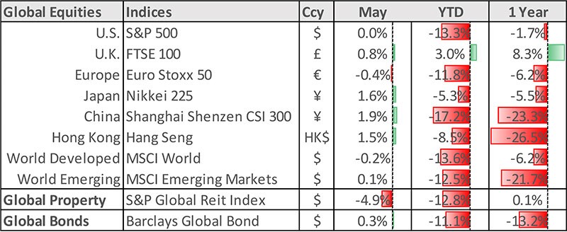 Global equity markets ended May mostly flat after staging a late rally in another turbulent month of trading. In the US, S&P 500 index finished the month with a marginal gain of 0.01%. Fears that mis-calculated Fed rate hikes could tip the US economy into a recession saw markets trade under intense volatility.