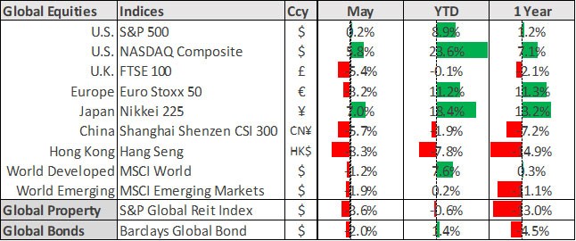 Concerns over the US debt ceiling were a drag on global stocks and bonds throughout May. Large-cap technology stocks were the exception, which continued to rally as investors clamoured for companies exposed to “generative AI” technology, largely due to the buzz surrounding OpenAI’s ChatGPT. The primary target was Nvidia (up over 170% YTD), known for its gaming GPUs (graphics processing units). Nvidia briefly joined the $1 trillion market-cap club before settling slightly lower.