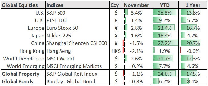 Markets remained hopeful that a phase one trade deal would be signed between China and the US. Optimism did, however, fade towards the end of the month after legislation supporting Hong Kong protesters was signed by President Trump. In response China warned the move could undermine cooperation with Washington. A trade deal with China needs to be signed before December 15 when a new round of import tariffs on Chinese goods are set to come into effect. China has seemingly conceded on one of the major sticking points- clamping down on violations of intellectual property rights.