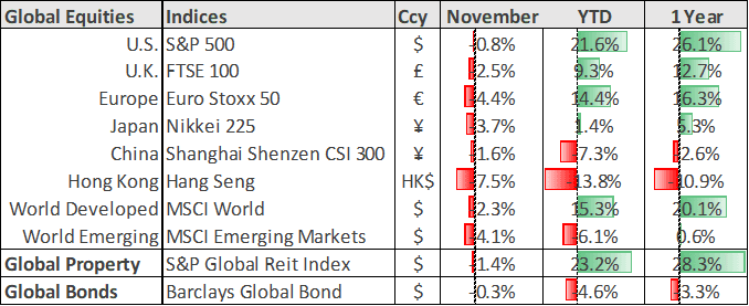 Global markets declined as the emergence of a new coronavirus variant, Omicron, triggered fresh fears of an economic fallout. The November 25th announcement of its discovery triggered global panic and a sharp sell-off in markets in the final days of November. In Europe, the Euro Stoxx 50 index declined 4.4% while the UK’s FTSE 100 index retreated 2.5%.In Asia, Japan’s Nikkei 225 index weakened by 3.7% while Hong Kong’s Hang Seng index sank 7.5%. In the US, markets fared relatively well as tech stocks cushioned the blow. The S&P 500 index closed 0.8% lower for the month.