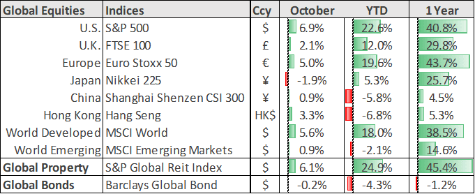 September and October are renowned for heightened market volatility, and this has certainly been the case. Stock markets climbed in October, following a dismal September showing, with developed market equities leading the way. In the US, the S&P 500 index gained 6.9%while in Europe the Euro Stoxx 50 index added 5.0%. Emerging markets were less upbeat with the MSCI Emerging Markets index gaining 0.9%.