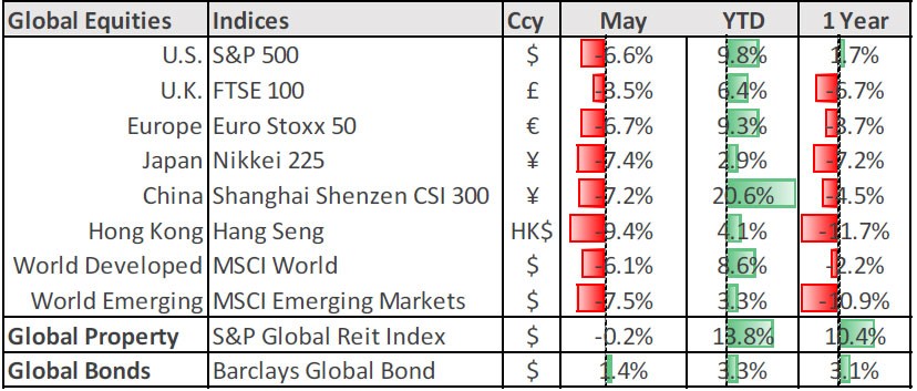 In the US, the S&P 500 Index declined by 6.6% in May. In Europe, the Euro Stoxx 50 Index fell 6.7% while in Asia the Nikkei 225 Index lost 7.4%. Emerging markets, as represented by the MSCI Emerging Markets Index, declined 7.5% in May.