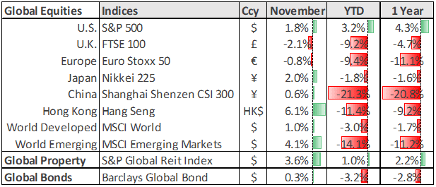 Markets remained on edge during November with most indices once again experiencing elevated levels of volatility. Most major indices dropped to year-to-date lows before rebounding in the final week of November.